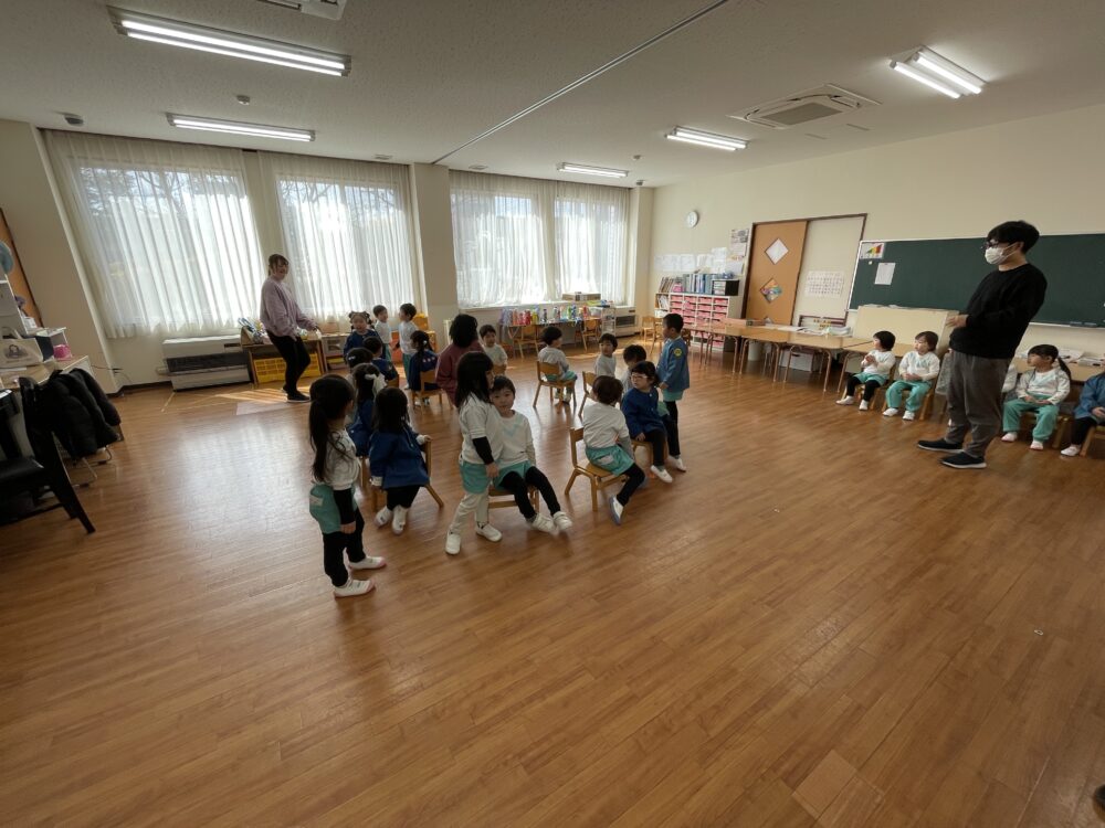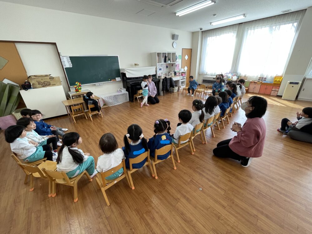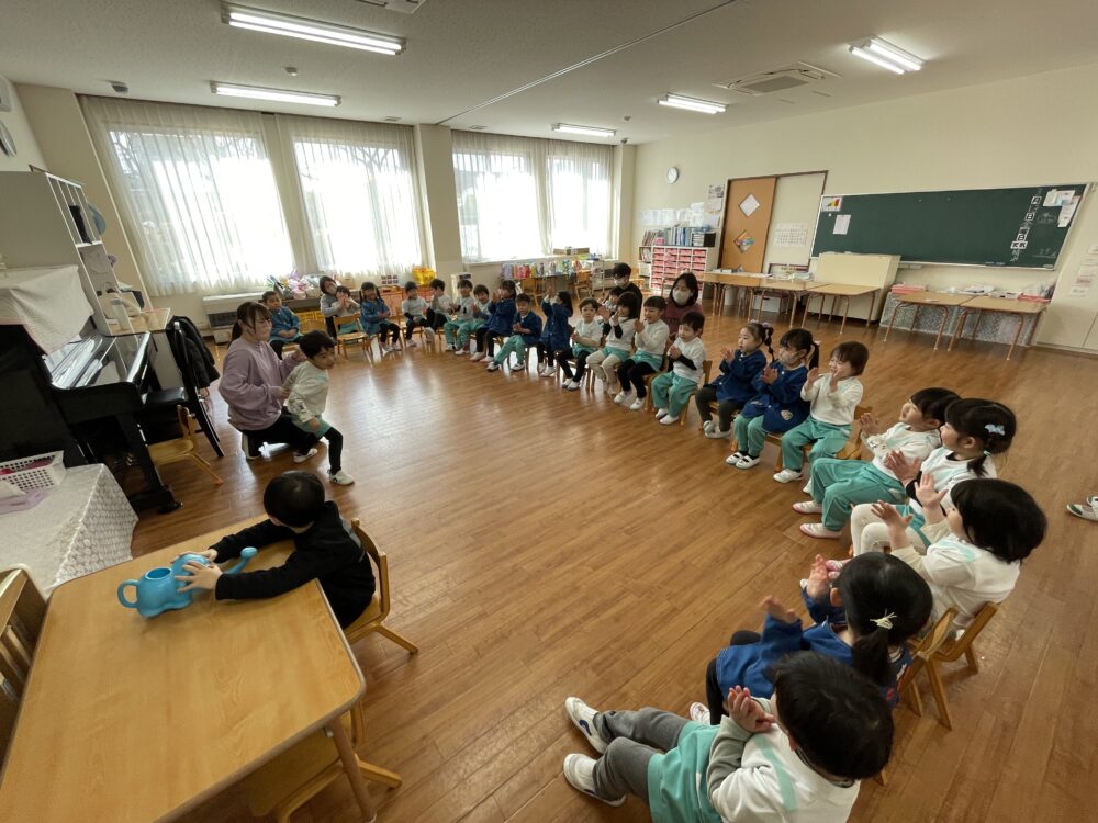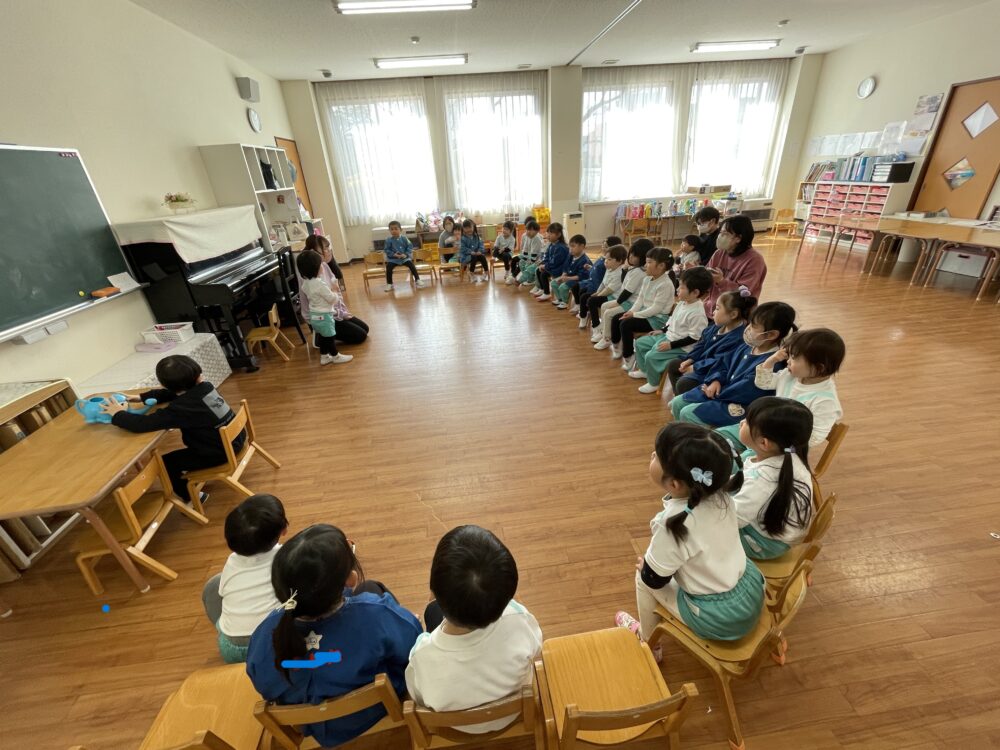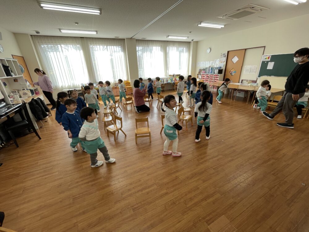 いちご組さんは、お楽しみ会をしました。最初に一番楽しかったことを一人一人発表しました。じょうずに発表できました。お友達の発表を聞く時の姿勢もすばらしいです。その後は椅子取りゲームして、カップケーキも食べました。