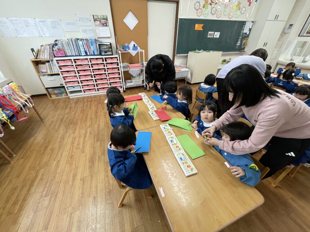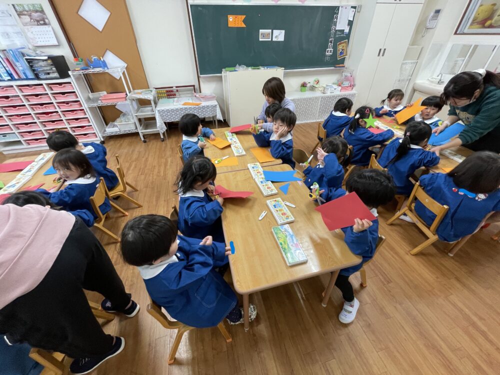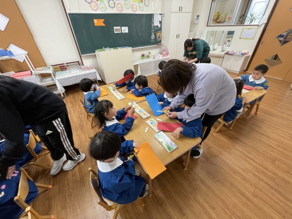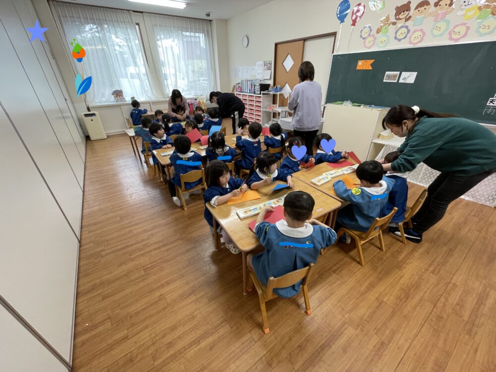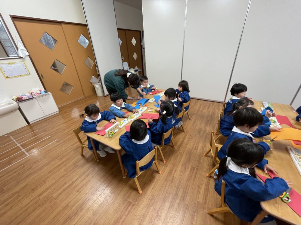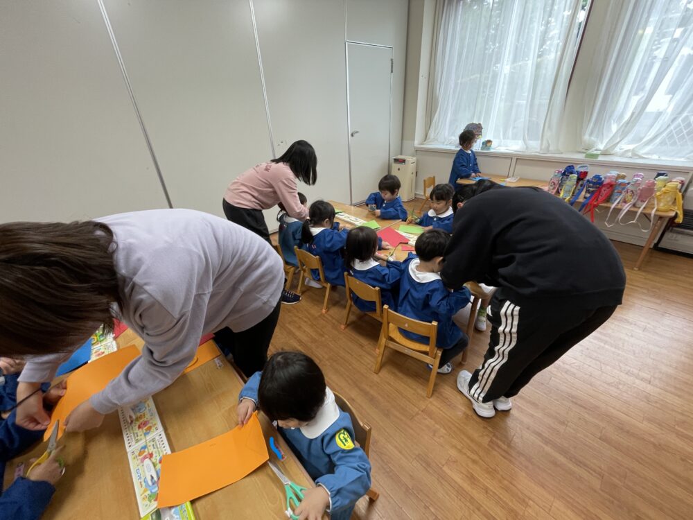 いちご組さんは、はさみを使ってこいのぼりを作っていました。はさみはまだ慣れていませんが、すぐにじょうずになってきます。みんな集中してがんばっていました。