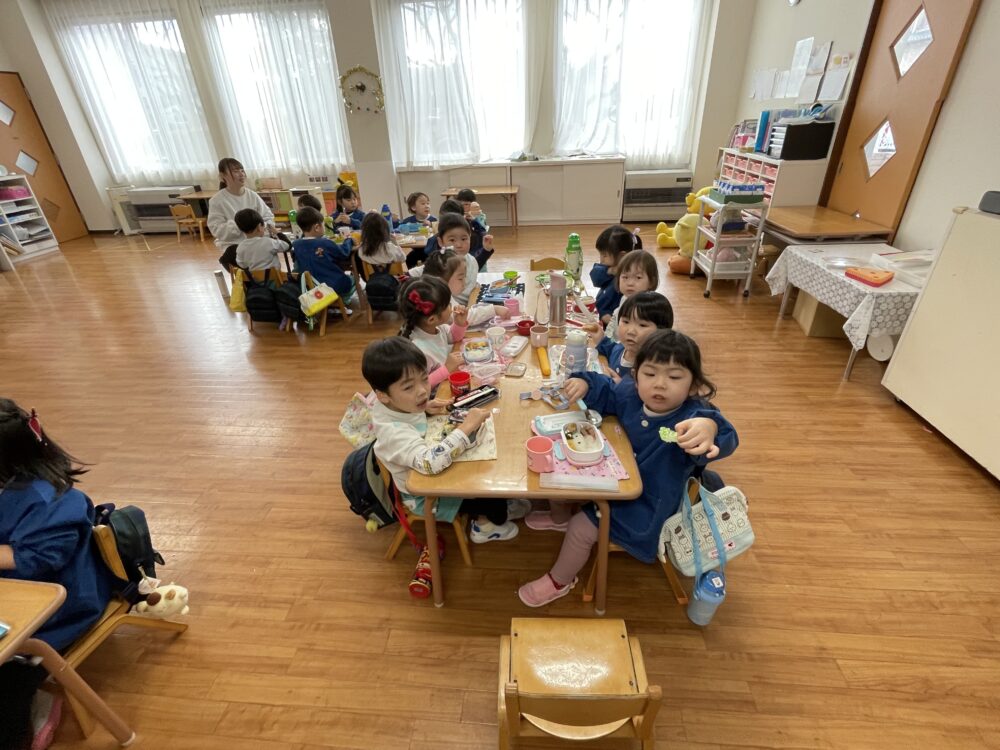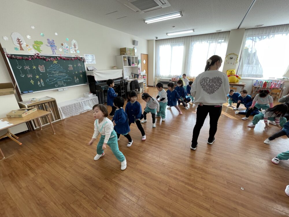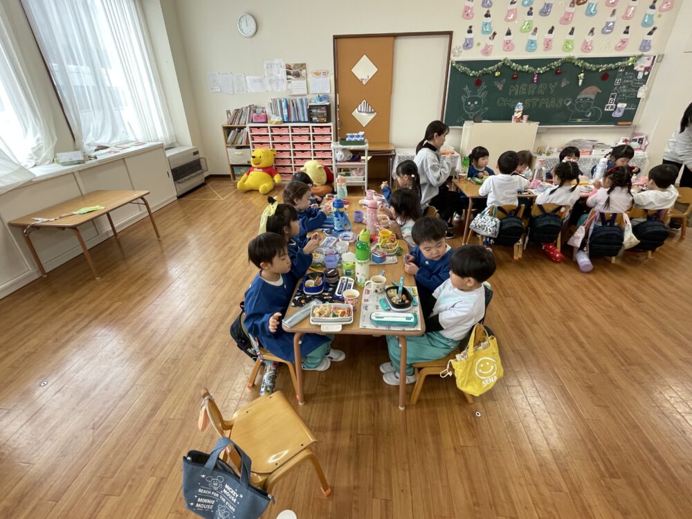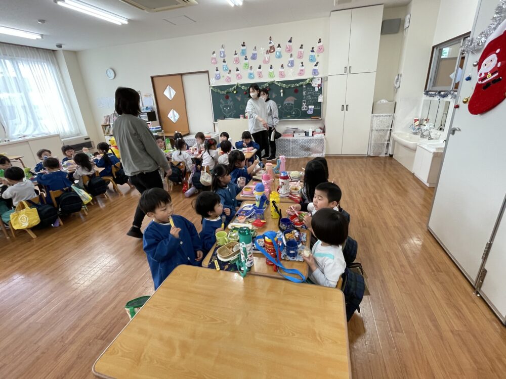 今日はクリスマス会をしました。各クラスでゲームをして楽しく遊び、お昼には、クリスマスケーキを食べました。どのクラスも笑顔がいっぱいでした。