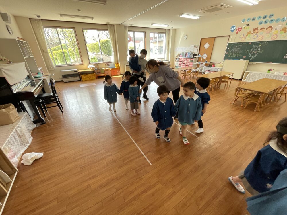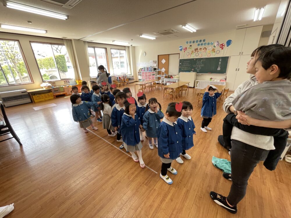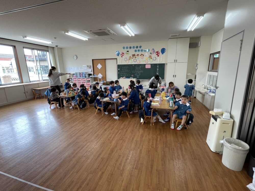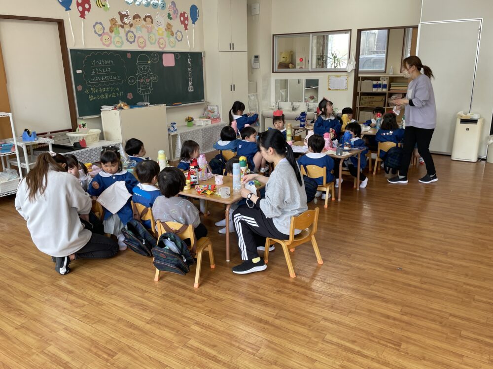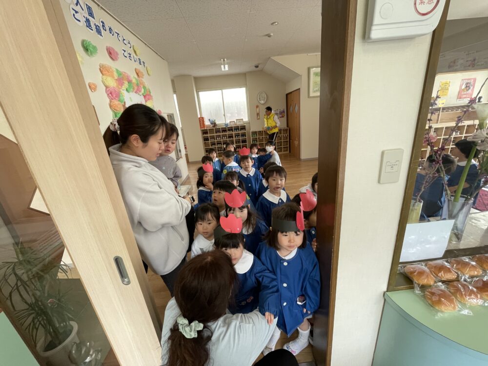 いちご組さんの1年間がスタートしました。今日は幼稚園の中を探検しました。給食は、パンでした。「おいしい」といって、お行儀よく食べていました。がんばった一日でしたね。