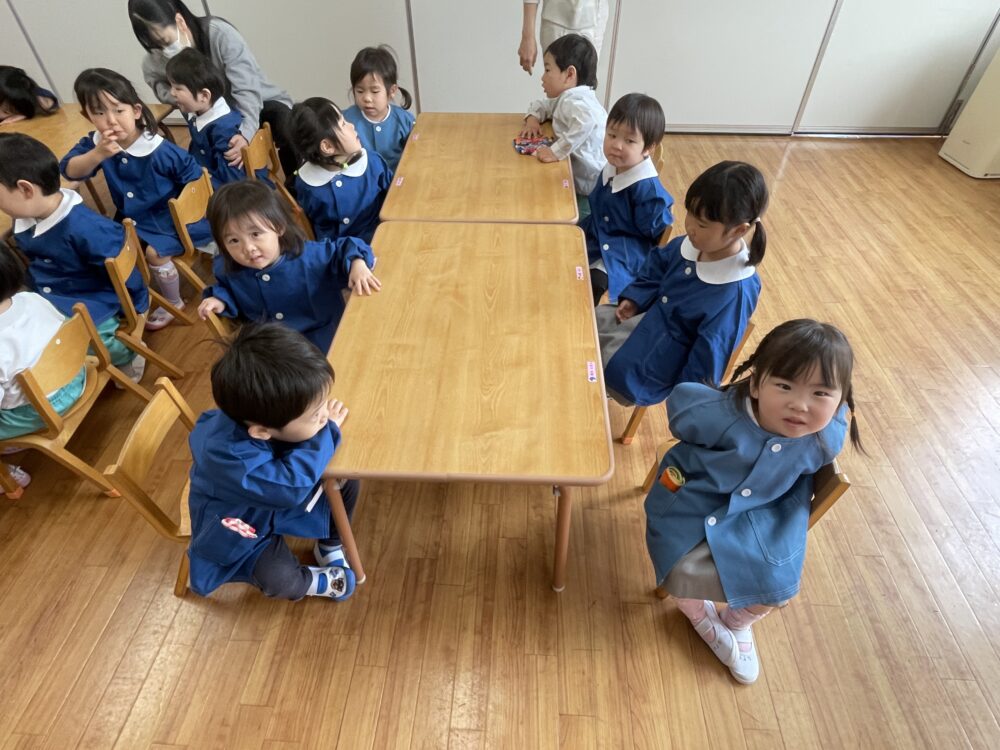 いちご組さんは、座り方、返事の仕方を教わりました。お話をよく聞いています。
