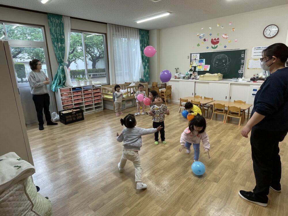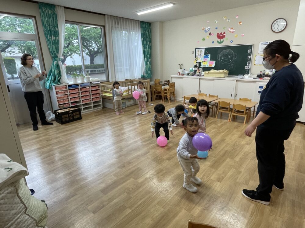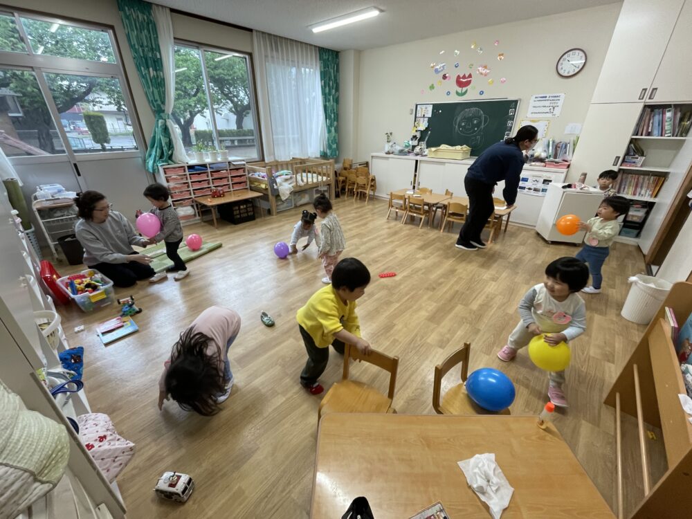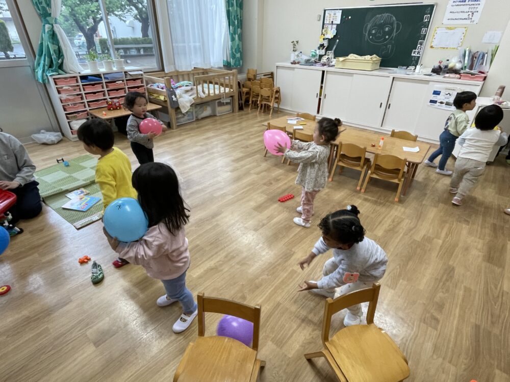 雨模様で大好きな外遊びができない日です。ふうせん遊びが、お部屋をぱっと明るく変えました。笑顔いっぱいのきらら・ひよこ組さんです。