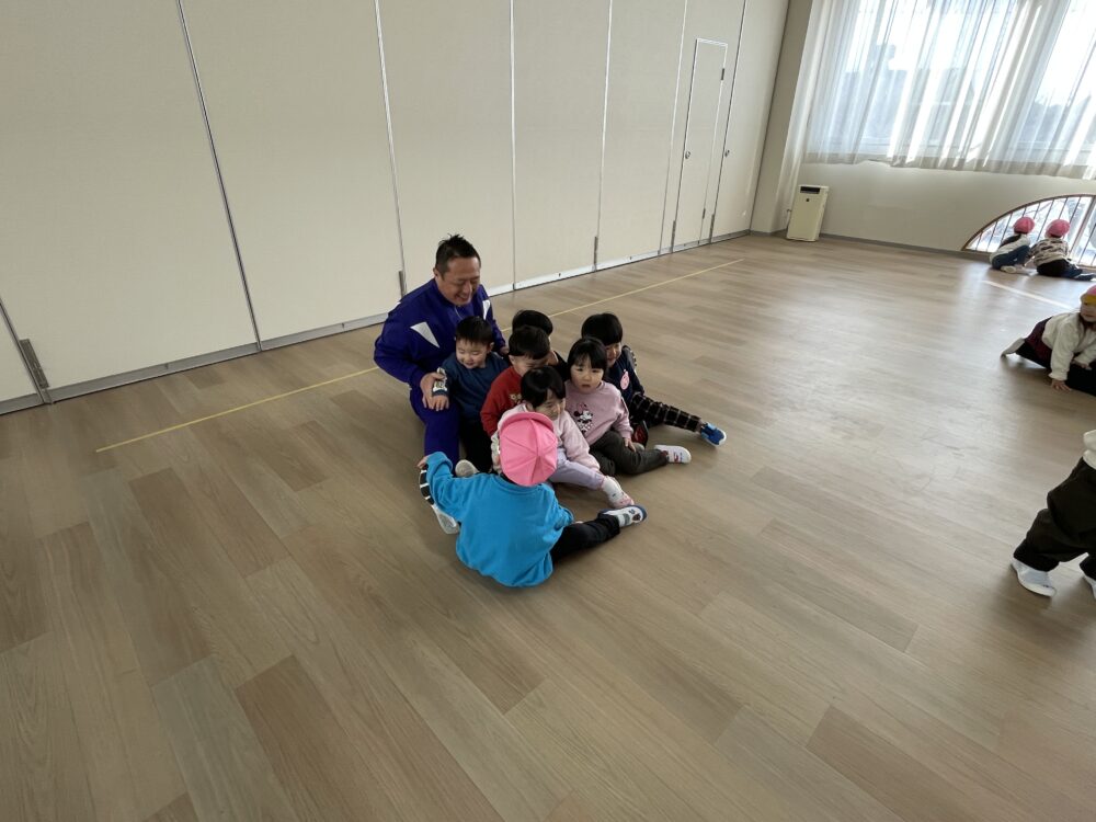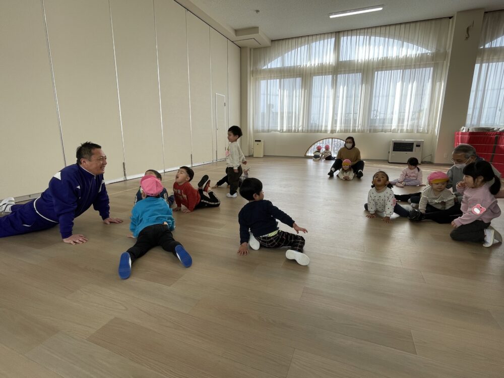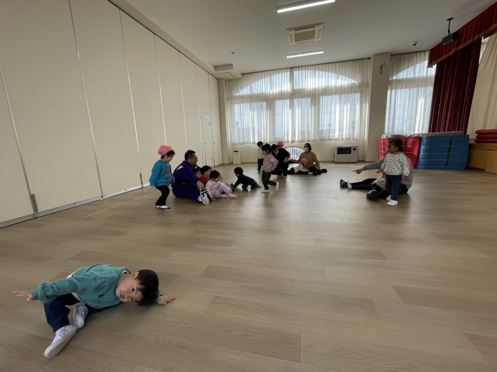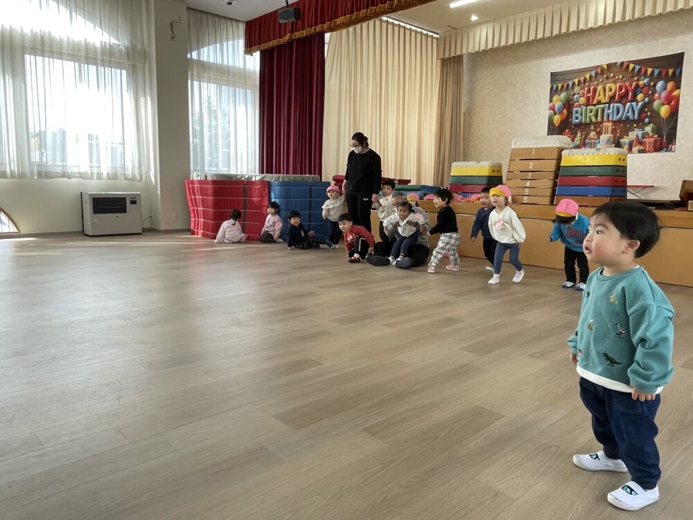 きらら・ひよこ組さんは、体操教室でした。体操の先生のお話を聞いて、楽しく運動をがんばっていました。線の上に並ぶこともできていました。