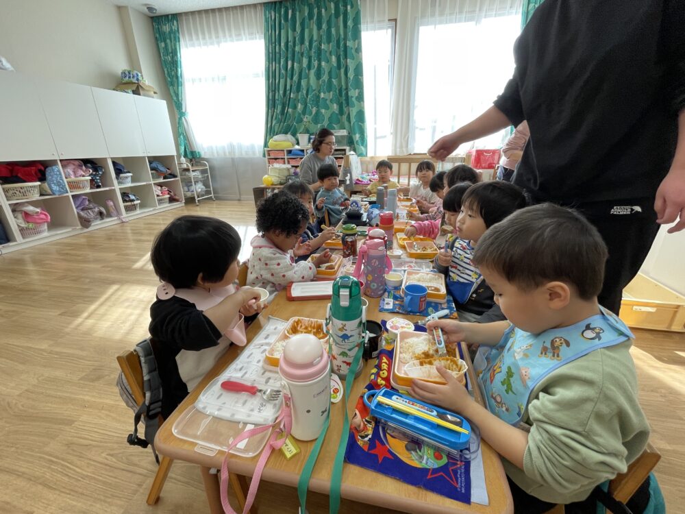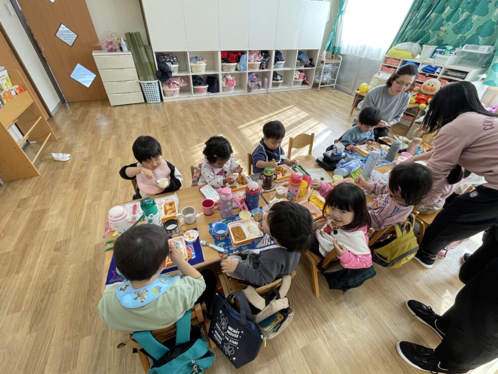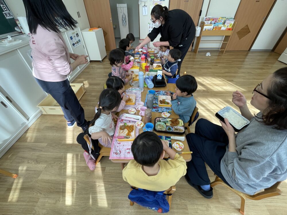 きらら・ひよこ組さんは、お行儀よく座って、給食を食べました。今日はカレーです。「だいすき」といってじょうずに食べました。