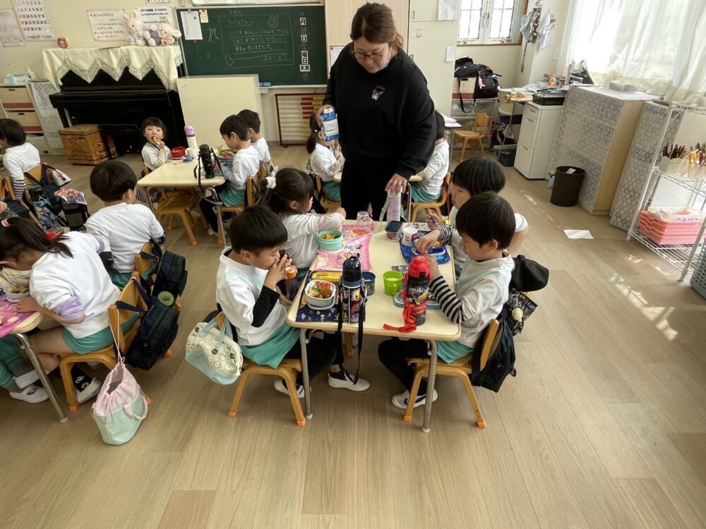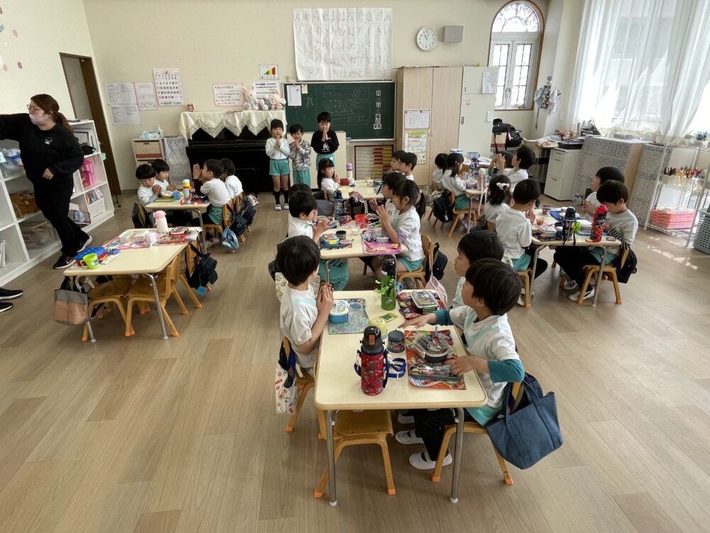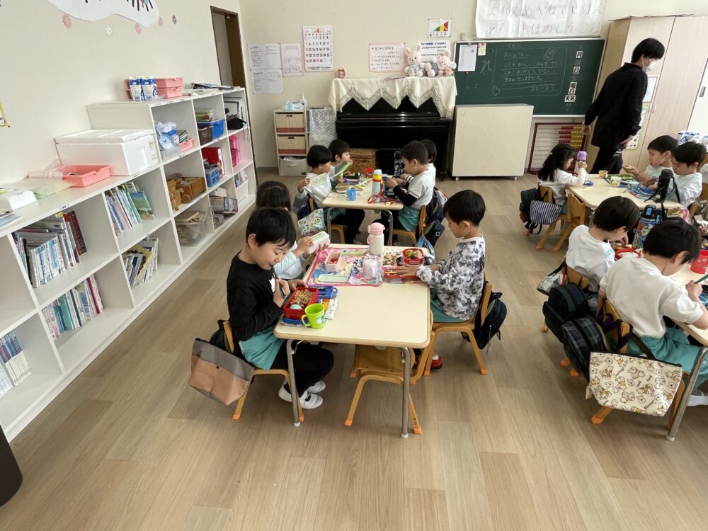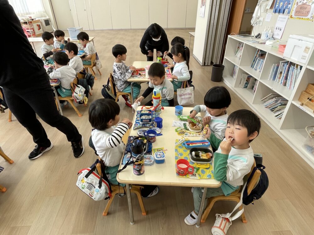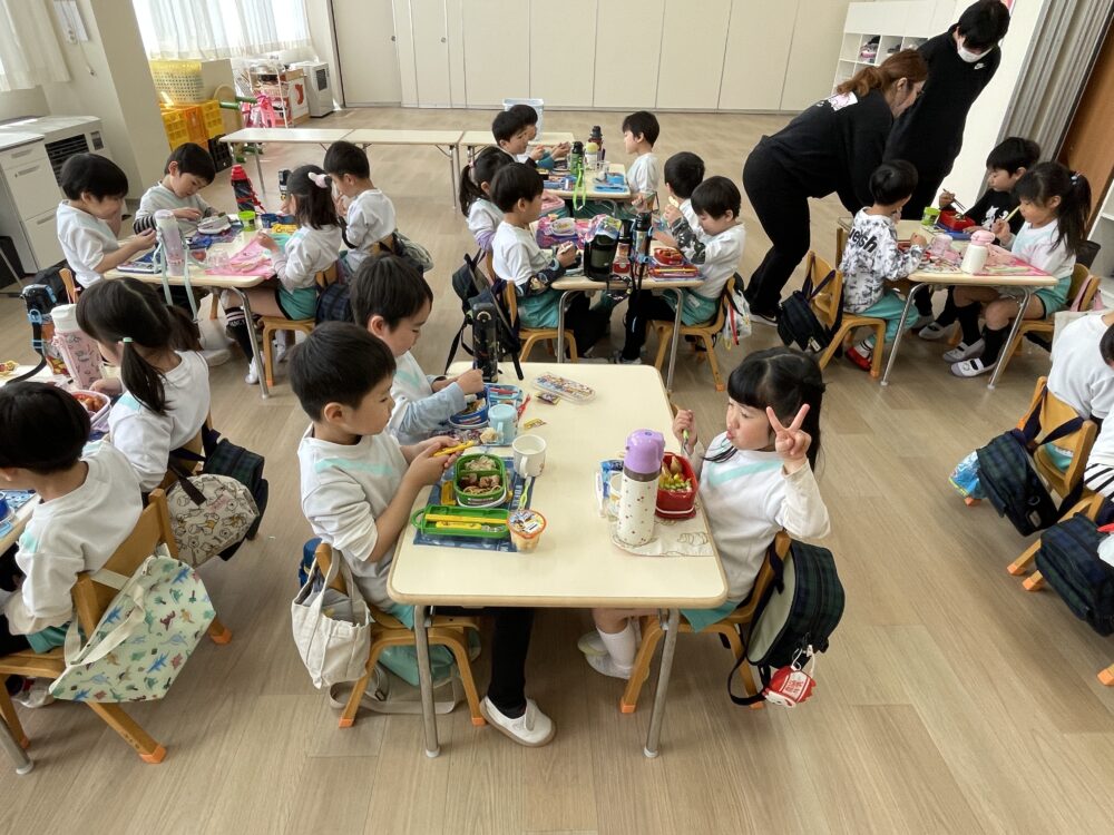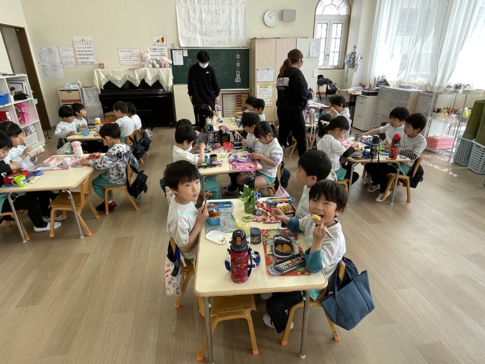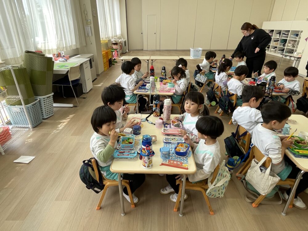 さくら組さんは、いただきますをしてから、みんな夢中で食べていました。フルーツやプチデザートも入っていました。おいしいよね。