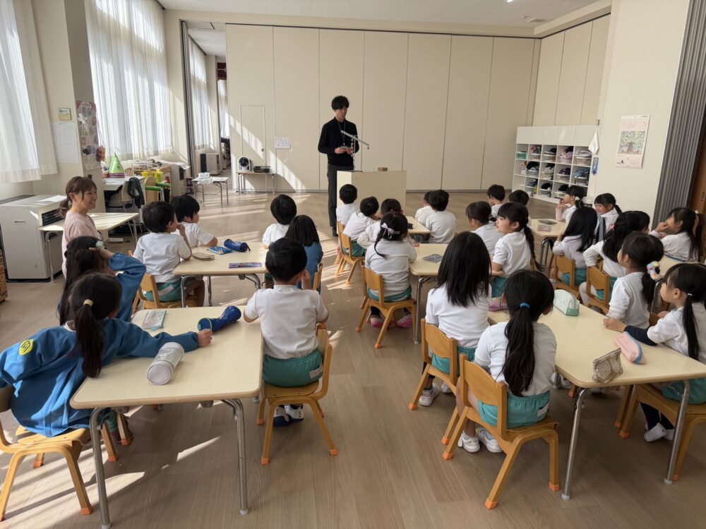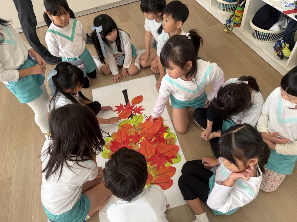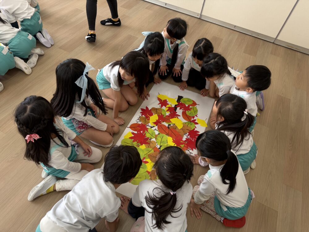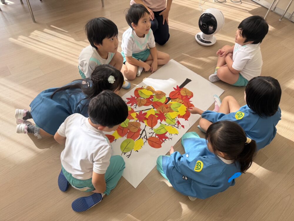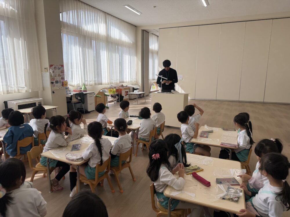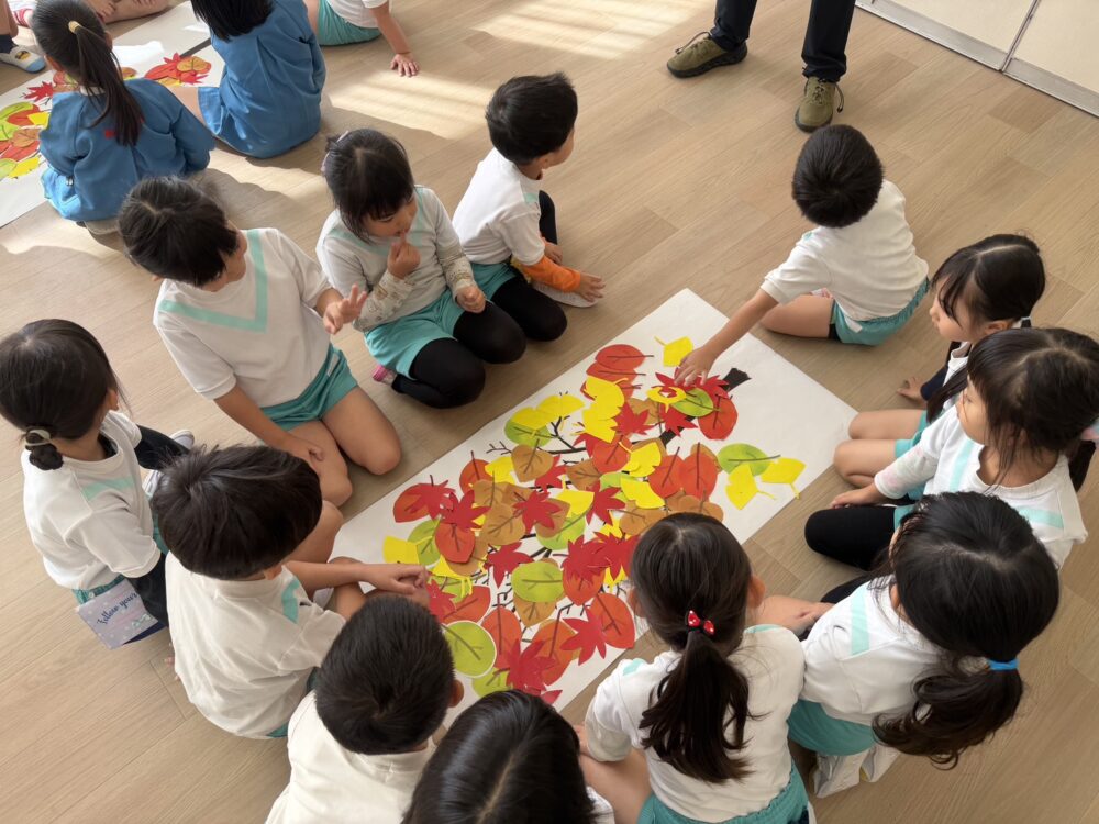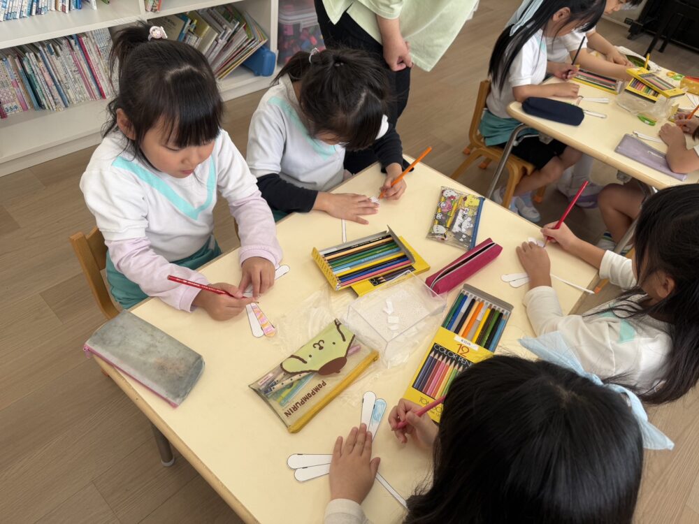 さくら組さんは、小学校の授業体験をしました。ザべリオ学園の理科と英語の先生が授業をしてくださいました。英語では葉っぱを使って色の勉強をしました。理科では、重さの不思議を勉強しました。どちらもゲームあり、製作ありで、とても楽しい授業でした。