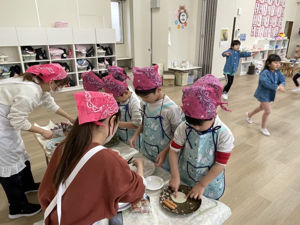 さくら組さんは、食育をがんばりました。ウインナーソーセージを餃子の皮で包んで、パリパリに焼きました。とってもおいしかったです。