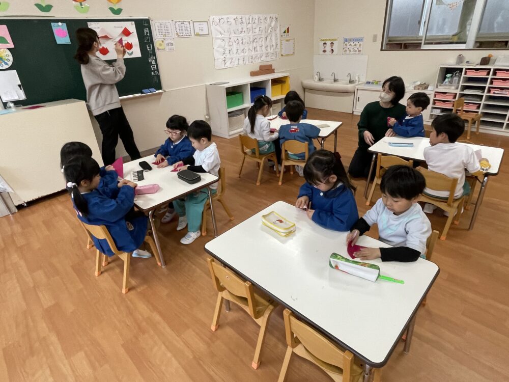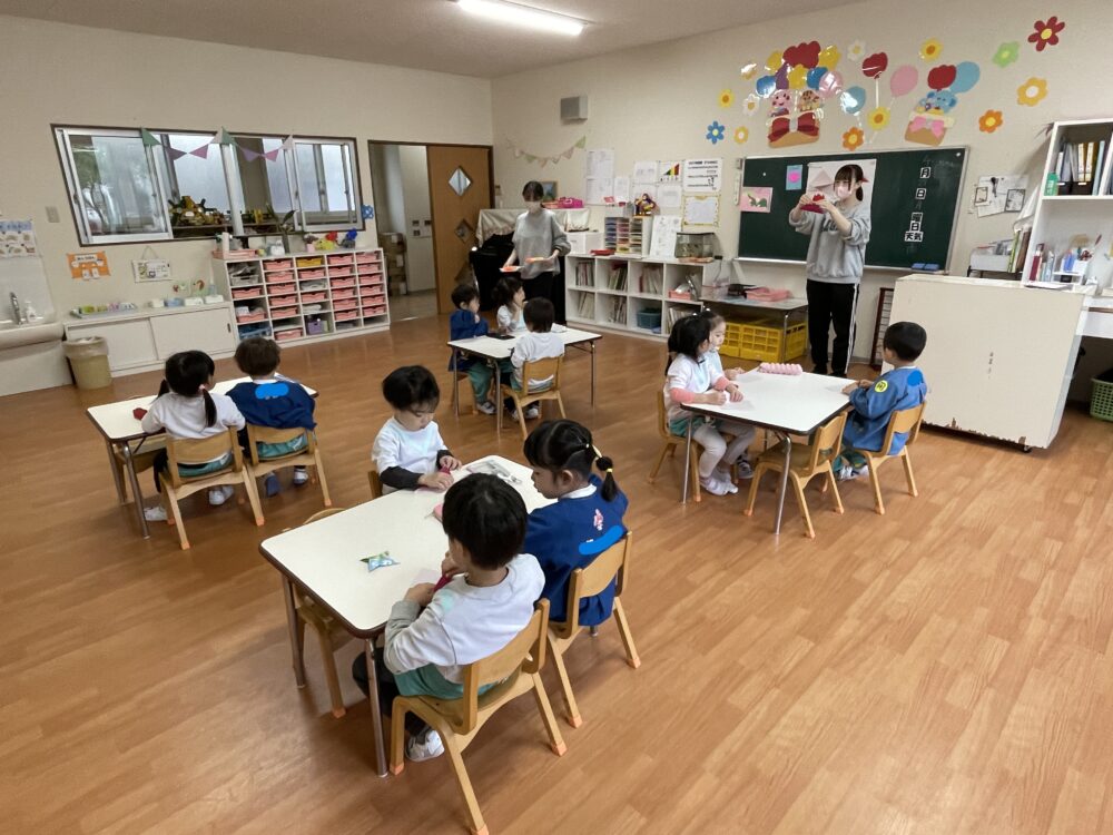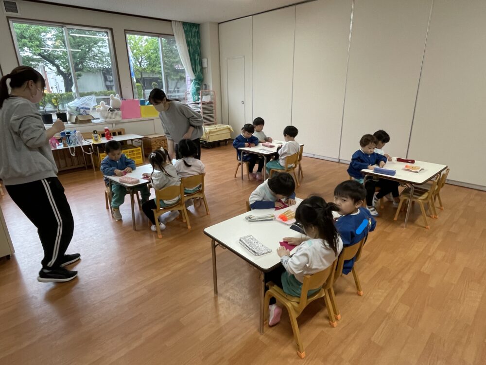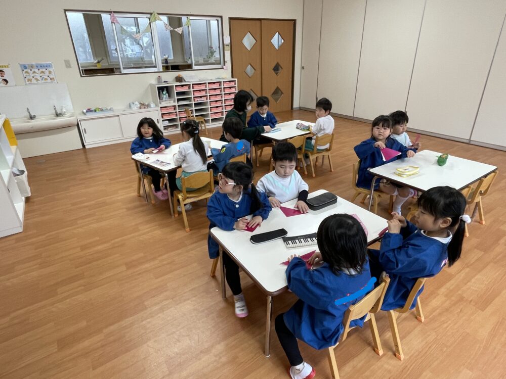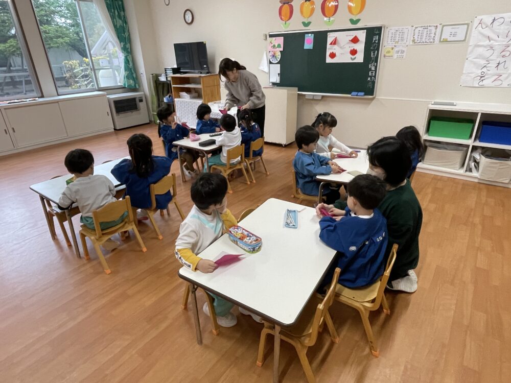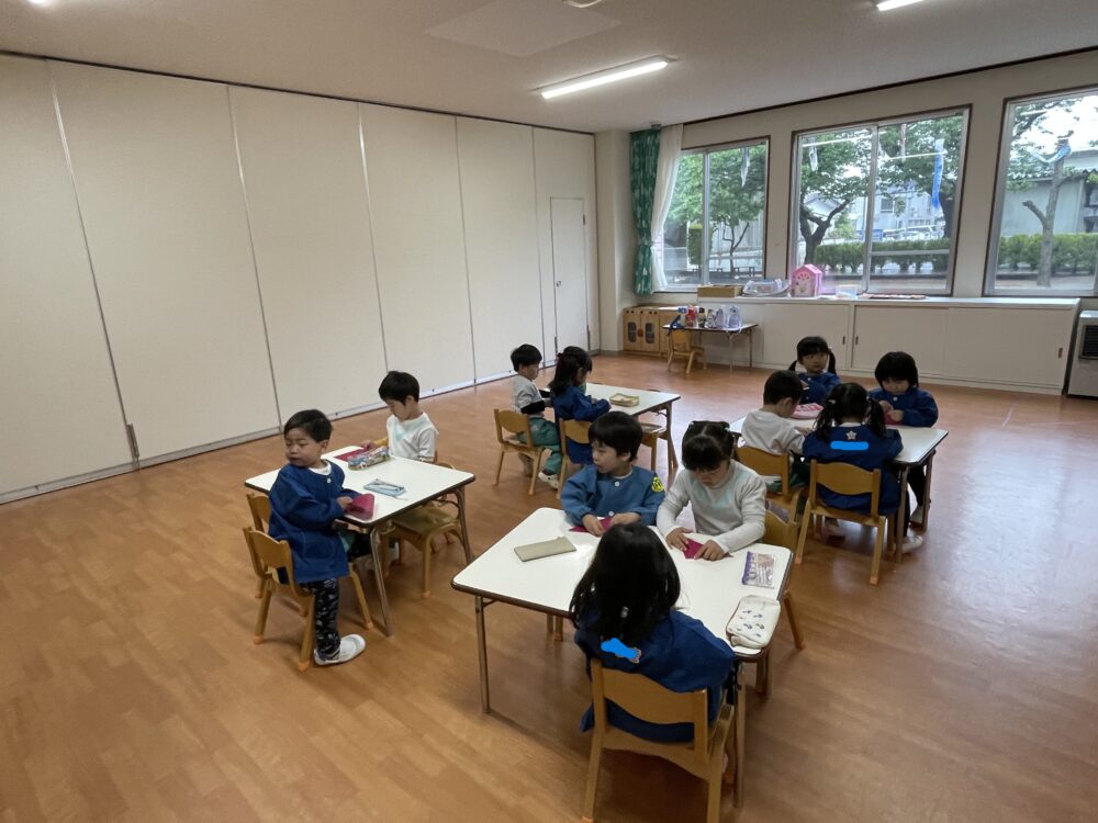 ゆり組さんは、折り紙でちゅうりっぷを作っていました。お話を聞く姿勢がすばらしいです。先生をよく見て集中しています。作業も集中してがんばっていました。
