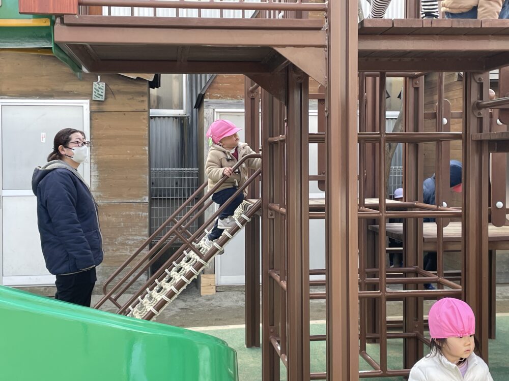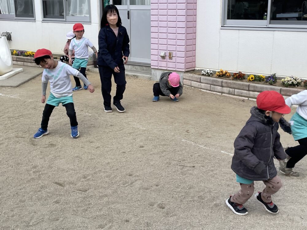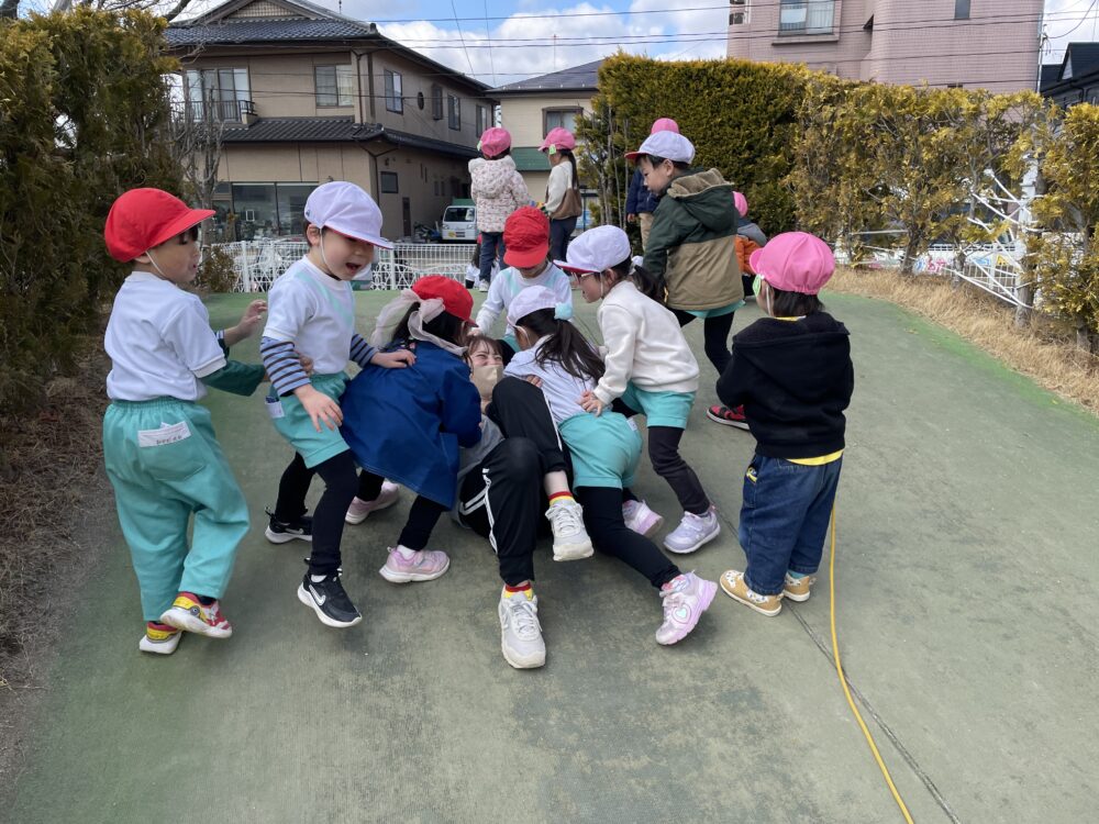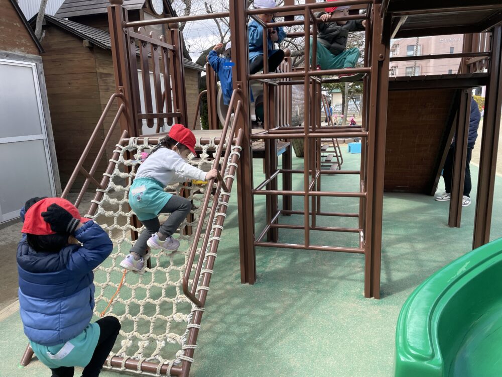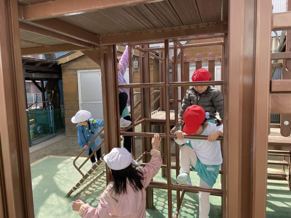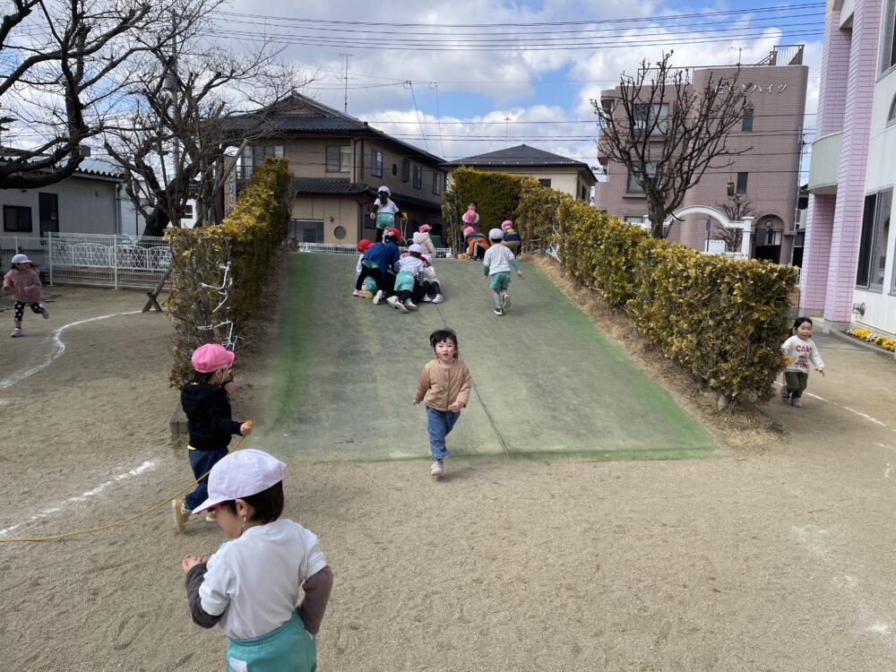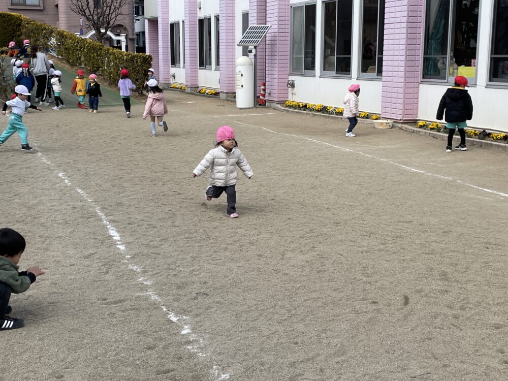 きらら・ひよこ組さん、いちご組さん、ゆり組さんは、外遊びをしました。少しずつ春らしくなっています。みんな元気に遊びました。